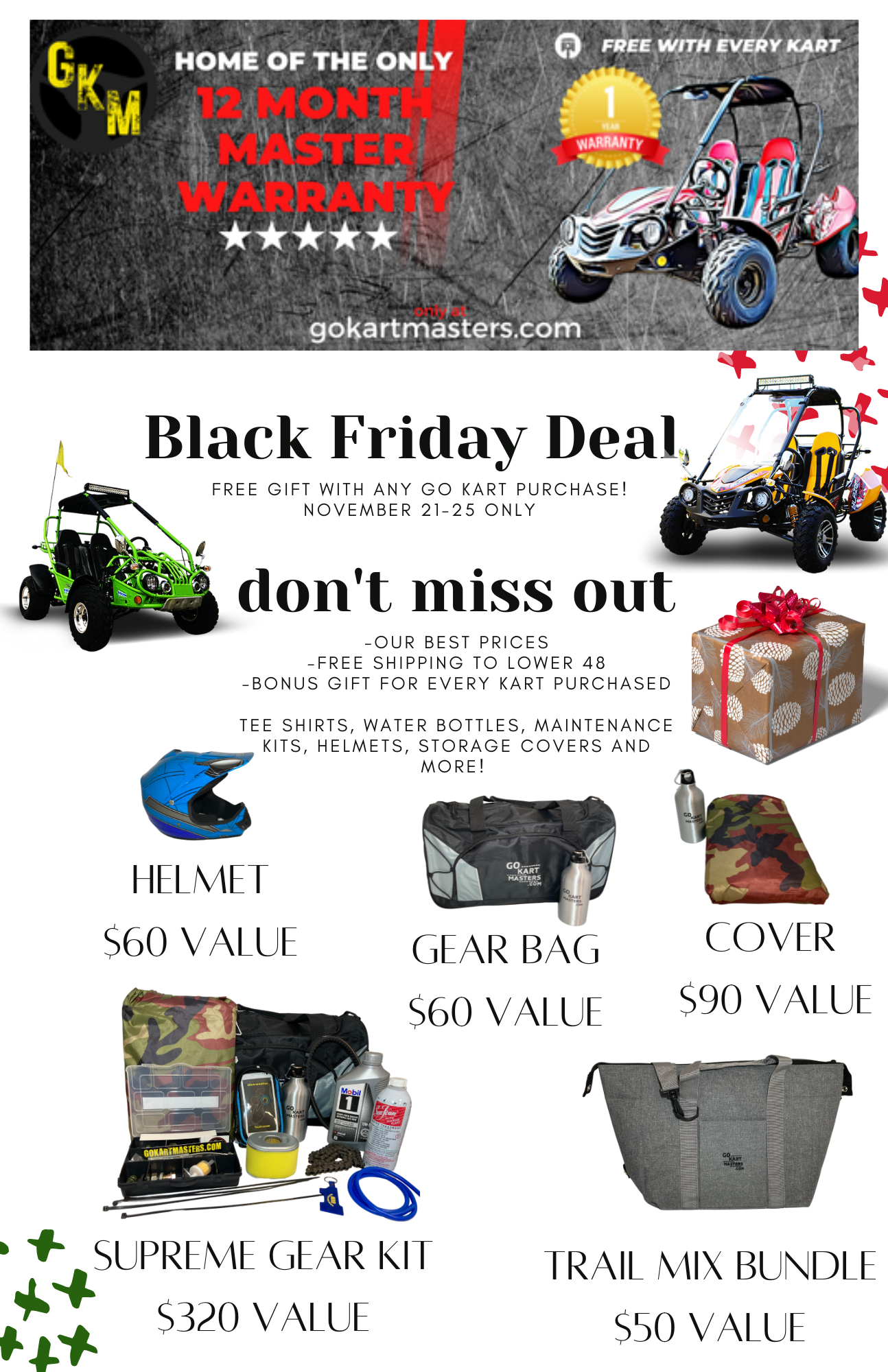 Our Black Friday sale is AMAZING! you'll get the best prices we have to offer, plus FREE shipping and guaranteed free gift. And we offer the only 12 month warranty on Trailmaster go karts-you won't a deal like this anywhere, Black Friday or otherwise.
